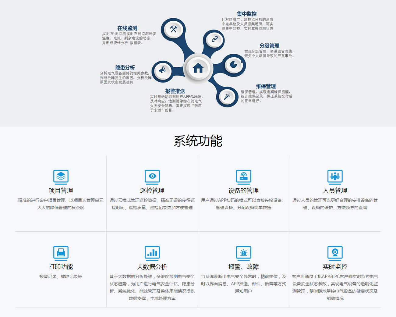 環(huán)保用電監(jiān)管系統(tǒng)通常包括用電監(jiān)控探測(cè)器、傳感網(wǎng)絡(luò)、監(jiān)控中心等多個(gè)組成部分。其中,用電監(jiān)控探測(cè)器負(fù)責(zé)實(shí)時(shí)接收監(jiān)測(cè)線路中的剩余電流、故障電弧等變化信息;傳感網(wǎng)絡(luò)則是由多個(gè)傳感器節(jié)點(diǎn)組成的無(wú)線網(wǎng)絡(luò),用于收集和傳輸數(shù)據(jù);監(jiān)控中心采用多級(jí)管理模式,監(jiān)測(cè)管轄區(qū)域內(nèi)聯(lián)網(wǎng)單位的報(bào)警、故障及設(shè)施運(yùn)行情況。此外,該系統(tǒng)還具備統(tǒng)計(jì)分析、實(shí)時(shí)監(jiān)控等功能,可以查詢企業(yè)的日功率曲線等統(tǒng)計(jì)數(shù)據(jù)。