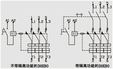 DHKBO結(jié)構(gòu)采用倒裝式設(shè)計,接觸組觸頭及滅弧系統(tǒng)在安裝面底部,操作機構(gòu)及電磁傳動機構(gòu)在觸頭及滅弧系統(tǒng)的上部。觸頭的分合通過電磁傳統(tǒng)機構(gòu)的銜鐵的吸合、斷開來實現(xiàn)。操作機構(gòu)可通過就地或遠(yuǎn)程控制電磁傳動機構(gòu)的線圈通斷來控制產(chǎn)品接觸組的主觸頭通斷。