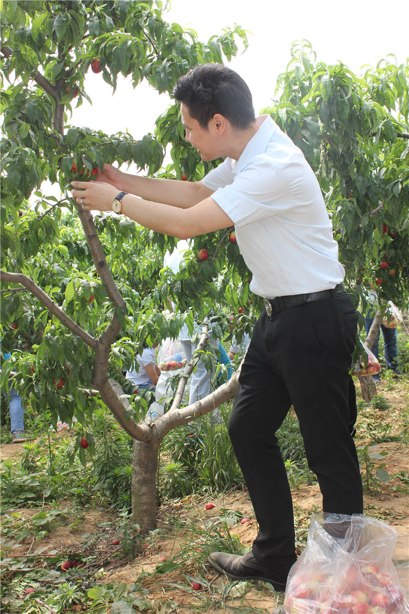 片刻休整后,采摘活動(dòng)正式開始。大片的油桃樹,上邊掛著青的、黃的、紅的,大的、小的各種油桃,讓人垂涎欲滴。大家來(lái)不及裝進(jìn)袋子,等活動(dòng)結(jié)束再吃,都迫不及待的摘下來(lái),或簡(jiǎn)單擦拭、或用少量礦泉水簡(jiǎn)單清洗,馬上就開伙,連黃總:吃多了拉肚子的警告都當(dāng)了耳旁風(fēng)。